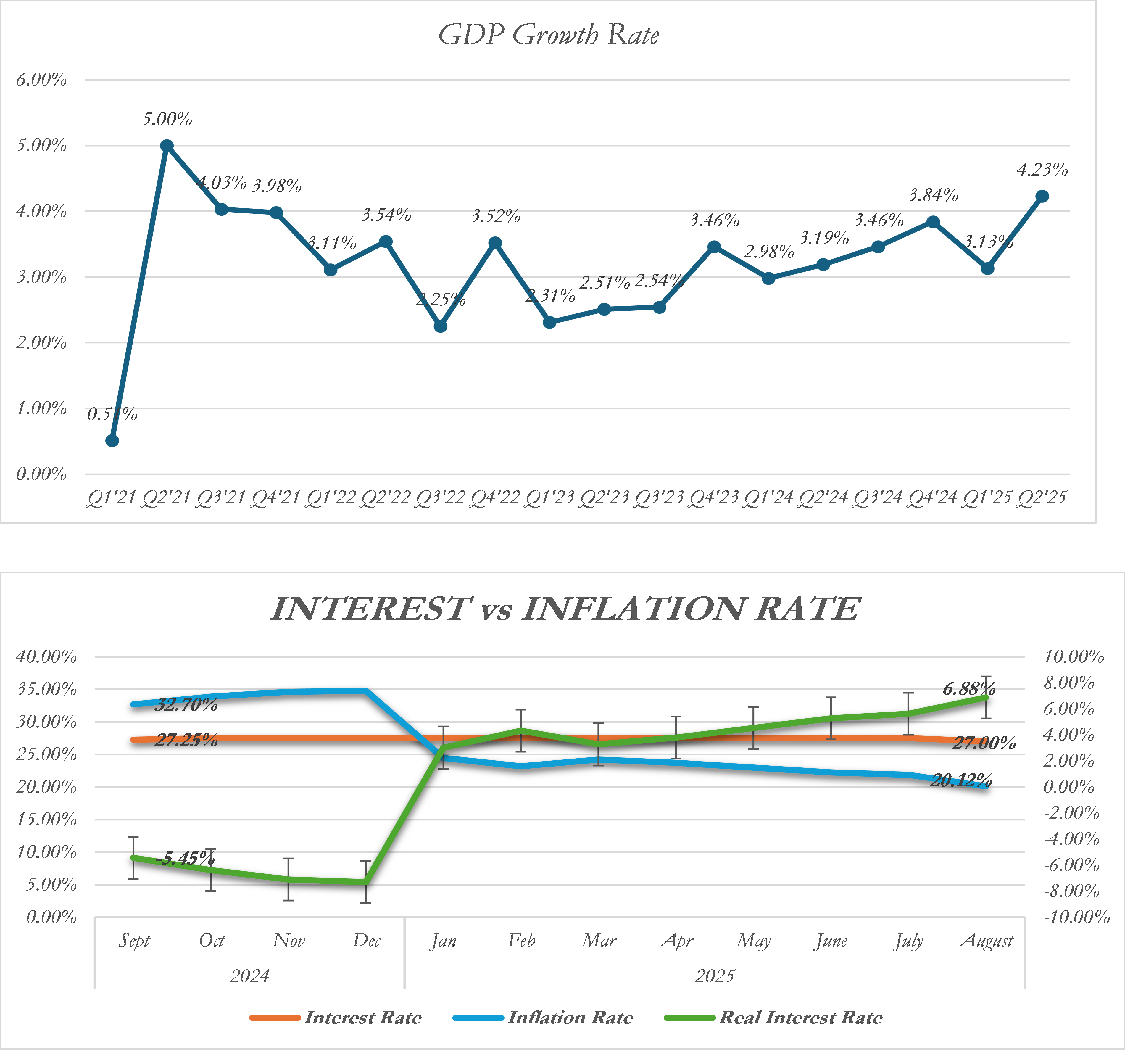 According to the National Bureau of Statistics (NBS), Nigeria’s economy grew by 4.23% y/y in real terms in the second quarter of 2025. This growth rate is higher than the 3.48% recorded in the second quarter of 2024 and the 3.13% recorded in Q1 2025, driven by growth across both the oil and non-oil sectors. The oil sector delivered its strongest performance under the revised methodology, rising 20.46% y/y (vs. 10.08% in Q2:2024), supported by higher crude output (1.68mbpd vs. 1.41mbpd) and a low base effect.