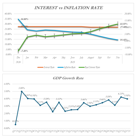 Headline inflation decelerated noticeably in November 2025, easing to 14.45% y/y from 16.05% in October (–160bps). This marks the eighth consecutive month of disinflation, underscoring a sustained moderation in year-on-year price pressures, largely reflecting favorable base effects and the lagged impact of earlier monetary tightening.